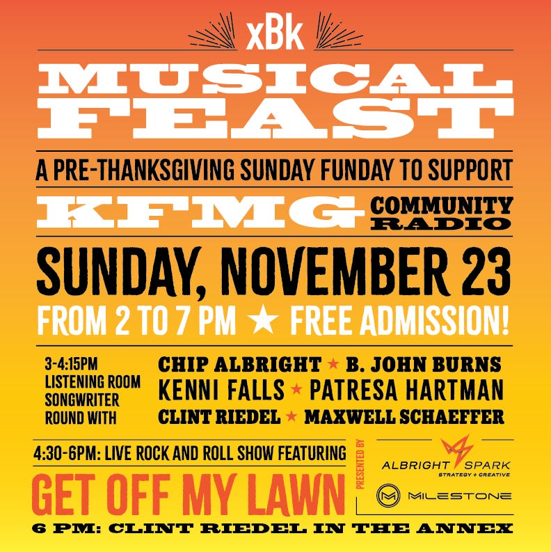 Maxwell is joining the songwriter round to support KFMG Community Radio this Sunday, November 23 at 3pm so please mark your calendars for this FREE Musical Feast at xBk in Des Moines. We’ve got a robust group of Iowa singer-songwriters coming together and the highly acclaimed Get Off My Lawn ready to rock.
