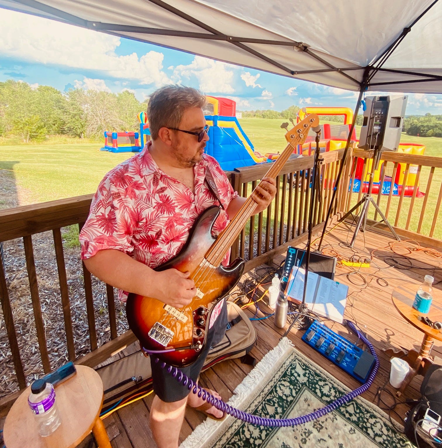 As we were setting up together and shooting the breeze under the tent, Sean put some kind of oil on my strings to help my fingers not feel so destroyed from the humidity and steel strings. Then Mike and I started chatting about equipment and shook on a trade with his 6-string Deering banjo headed my way in exchange for my Fender Blues Jr. amp. He thinks I can write some new songs on the 6-string banjo and he’s got a Strat project for the amp. We erected the tent as a trio and built a cozy little fort for the night overlooking bouncy houses on a lush green golf course. We jammed, watched kids fly through those bounce houses and roll balls on the putting green, cracked some jokes with the crowd, commented on the group that brought bubbles, made some new friends and had a symphony of smiles between us making some new memories.