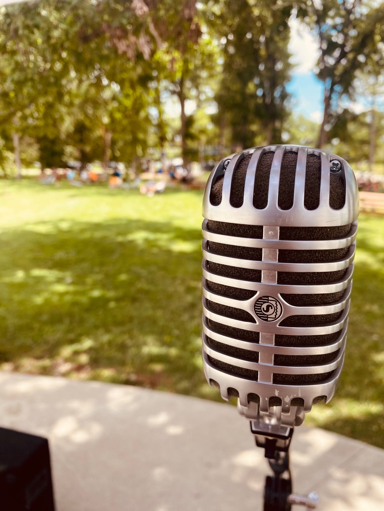 First, an old acquaintance, Michael, showed up to say hey and that he’s been following me. He couldn’t stick around but wanted to make sure he said hey and gave me a fist bump. I had some initial power issues setting up but noticed the ‘test’ button had tripped so I pushed it in and saw the magic blue light on the amp. I made some other set-up connections and started chatting through the mic. Deep in the back was a sleeveless biker. I asked “Hey, sleeveless biker man in the back, can you hear me?” He gave me a thumbs up from deep in right field and I felt a little extra wind to my back. We had power and sound, ahhhhhh, now we’re getting close to the fun part!